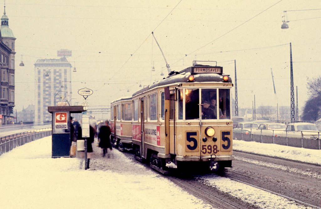 København / Kopenhagen KS am 13. Februar 1970: Der Zug der SL 5 bestehend aus dem Grossraumtriebwagen 598 und einem Grossraumbeiwagen ist gerade über Langebro, die "Lange Brücke", gefahren und hält an der Haltestelle Amager Boulevard / Thorshavnsgade auf der Insel Amager.