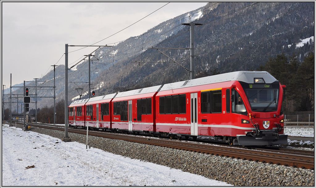 Domino-Mangel beim GlarnerSprinter: Für den GlarnerSprinter (Zürich-Glarnerland) gibt es zwei speziell umgebaute Domino-Einheiten. Beide sind täglich im Einsatz, wenn jedoch eine Defekt ist (kommt relativ häufig vor) muss auf herkömmliches Rollmaterial zurückgegriffen werden. Normalerweise dient ein DTZ als Ersatz, heute wurde jedoch wieder einmal ein Doppel RBe-Pendel verwendet. Im Bild ist er als Ersatz RE 3869/3878 beim Wenden in Schwanden GL. Vorne im Bild ist der RBe 540 036-1, 15.01.2013.