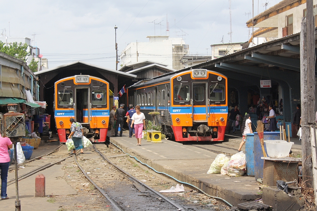 Bahnhof Mahachai am 24.Juli 2012: links der NKF 1201 (1A'2', dh, Nippon Sharyo, Bauj.1985) am Schluß des ORD 4316 nach Wongwian Yai, rechts ist der NKF 1205 (1A'2', dh, Nippon Sharyo, Bauj.1985) als ORD 4315 aus Wongwian Yai angekommen.