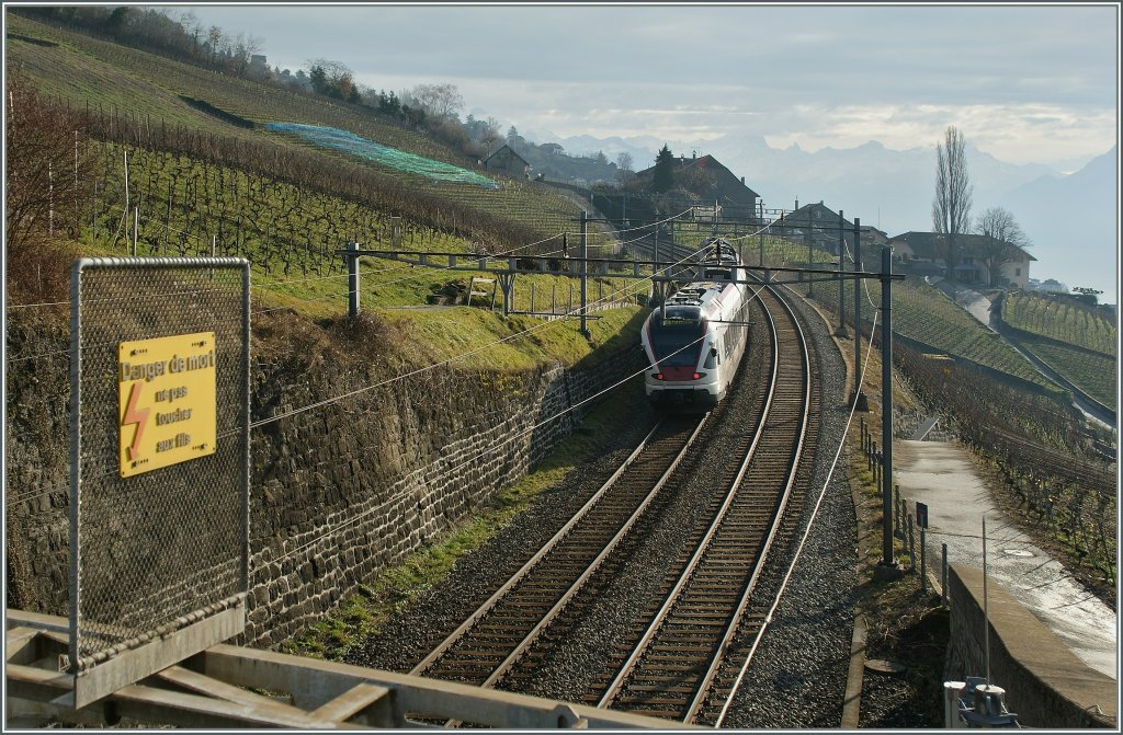 "Lebensgefahr, Leitungen nicht berühren" - und leist summt die Energie aus der Fahrleitung beziehnd ein Flirt Richtung Palézieux.