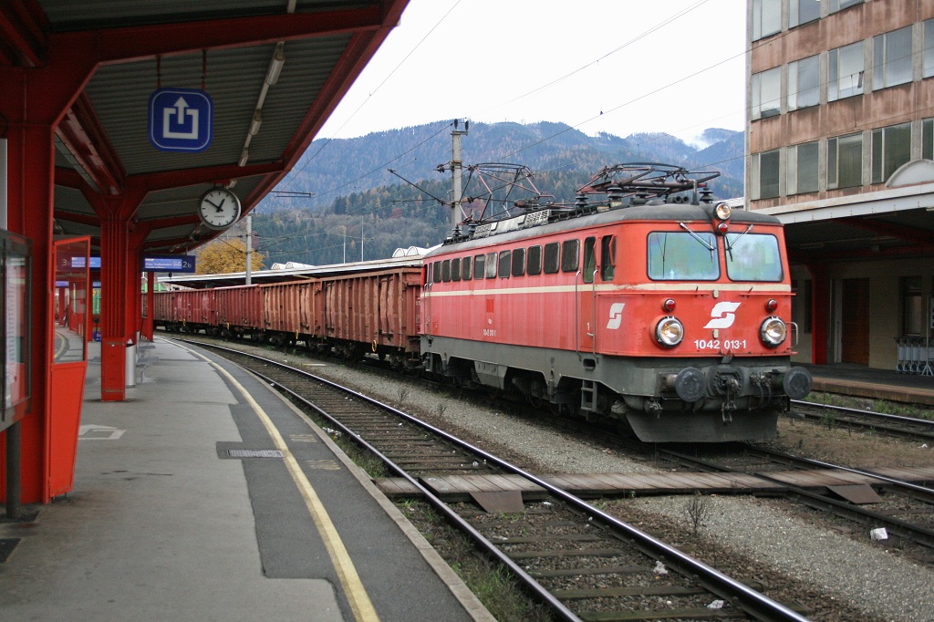 1042 013 fährt am 10.11.2009 mit einem Güterzug durch Bruck/Mur.