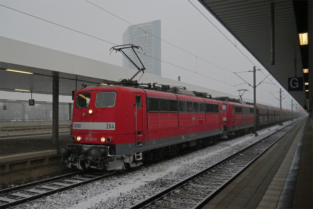 151 143-5 und 151 004-9 sind jetzt auch für die DB-Tochtergesellschaft RBH Logistics unterwegs; hier mit einem Kohlezug in Mannheim. (16.01.2013)