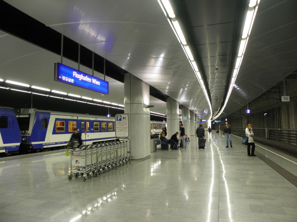 28.4.2011: Der unterirdische Bahnsteig des Bahnhofs Flughafen Wien. Am gegenüberliegenden Gleis eine Doppelgarnitur 4020 der Wiener S-Bahn als S7 abfahrbereit in Richtung Wolfsthal. Der Zug kommt aus Wien-Floridsdorf.