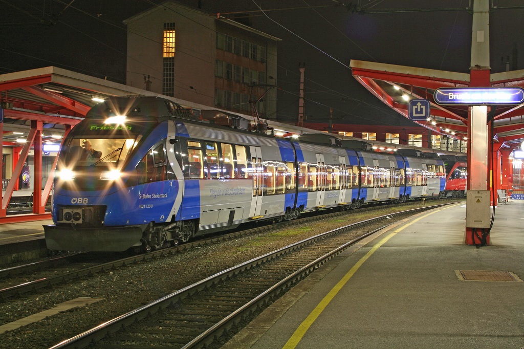Winter im Murtal - Ein 4024 fährt als R4223 von Graz nach Unzmarkt, hier beim Halt in Knittelfeld.