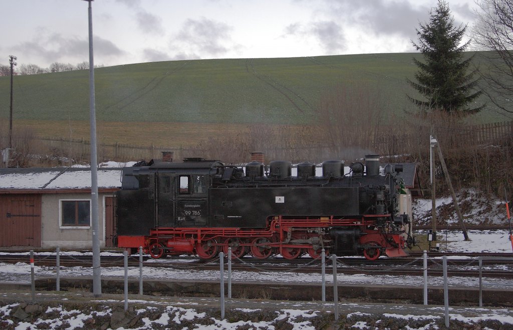 99 786 am 30.12.2012 während einer Verschnaufpause im Bahnhof Cranzahl. Wenig später wird sie P1010, den letzten Zug des Tages, nach Oberwiesenthal befördern.