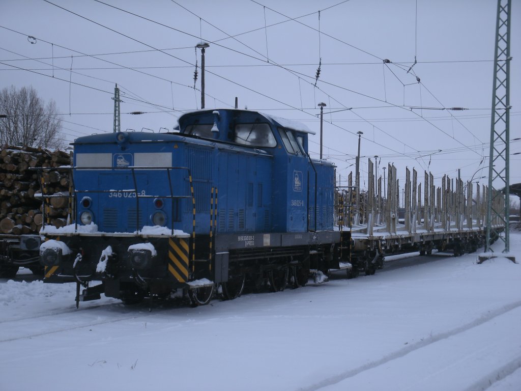 PRESS 346 025 holte leere Laaps-Wagen,am 08.Dezember 2012,um Diese auf der Ladestraße von Bergen/Rügen zur Beladung bereitzustellen.