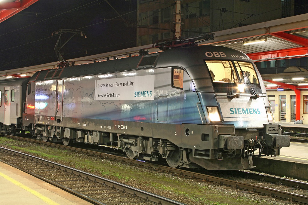 Am 16.11.2009 steht die 1116 038 (Siemens) in Bruck/Mur am Bahnsteig 3.