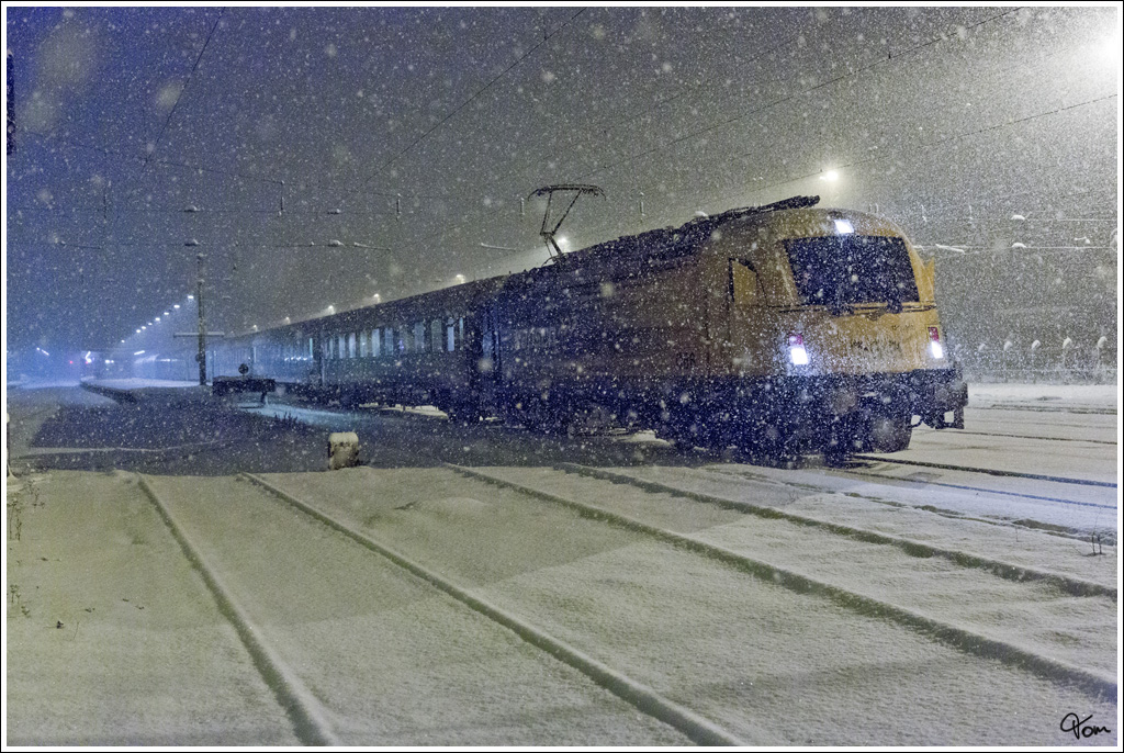 Bei dichtem Schneefall und einer leichten Verspätung von 1 1/2 Stunden, fährt 1216 210 "Kapsch" mit dem EC 173 "Vindobona" (Hamburg Altona - Villach) aus dem Bahnhof Knittelfeld aus.