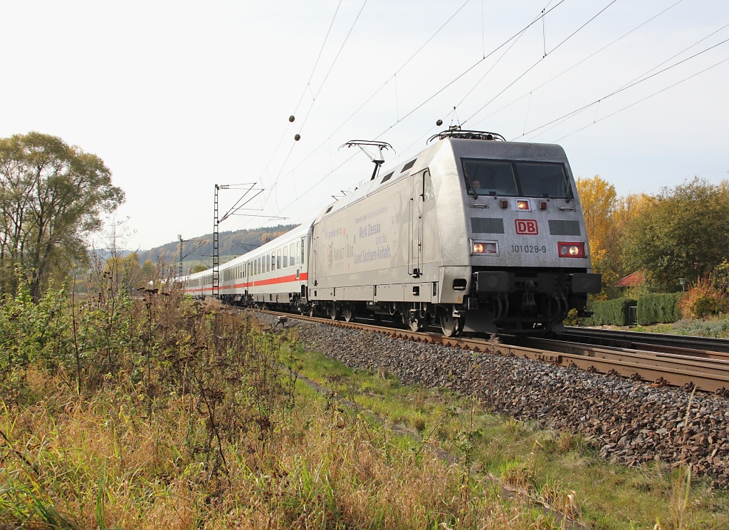 101 028-9 mit IC in Richtung Bebra. Aufgenommen am 20.10.2012 bei Mecklar.