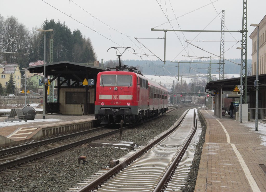 111 226-7 steht am 19. Januar 2013 mit einer Regionalbahn nach Saalfeld auf Gleis 2 in Kronach.