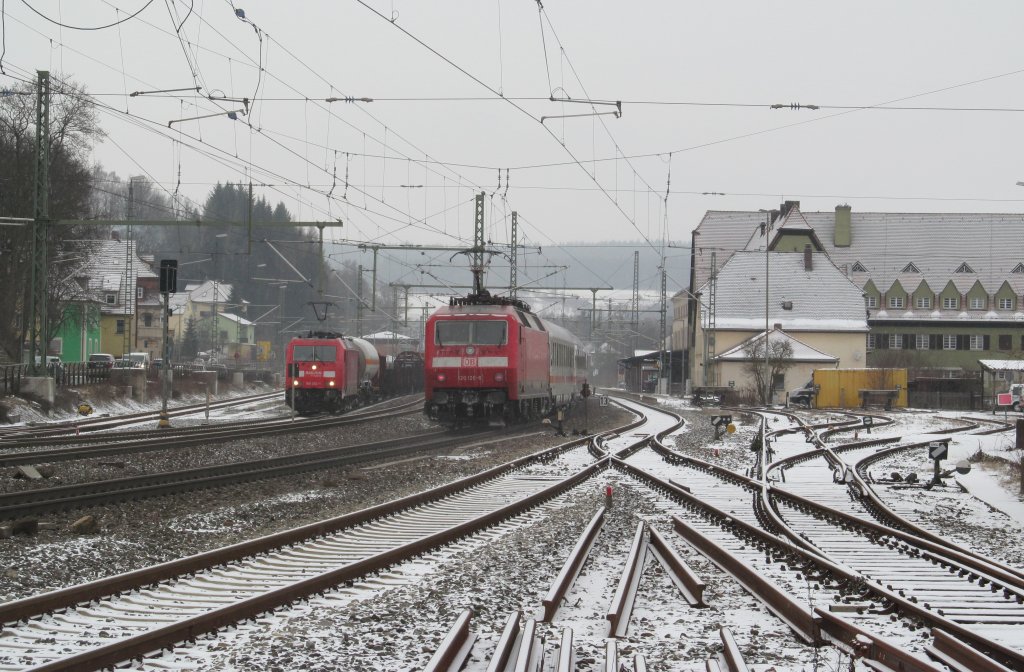 185 282-1 verlässt am 17. Januar 2013 mit einem gemischten Güterzug den Bahnhof Kronach.