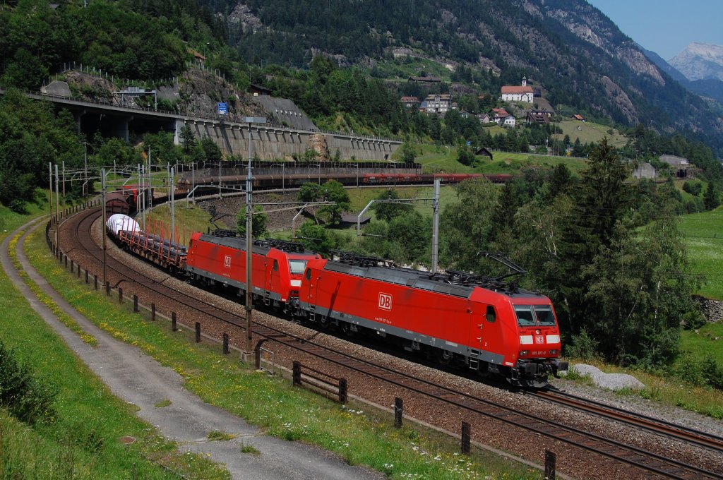 185 107-0 und 185 104-7 durchfuhren am 24.07.2012 mit einem langen gemischten Güterzug die bekannte "Wattinger Kurve" auf der Gotthardstrecke kurz vor Wassen.