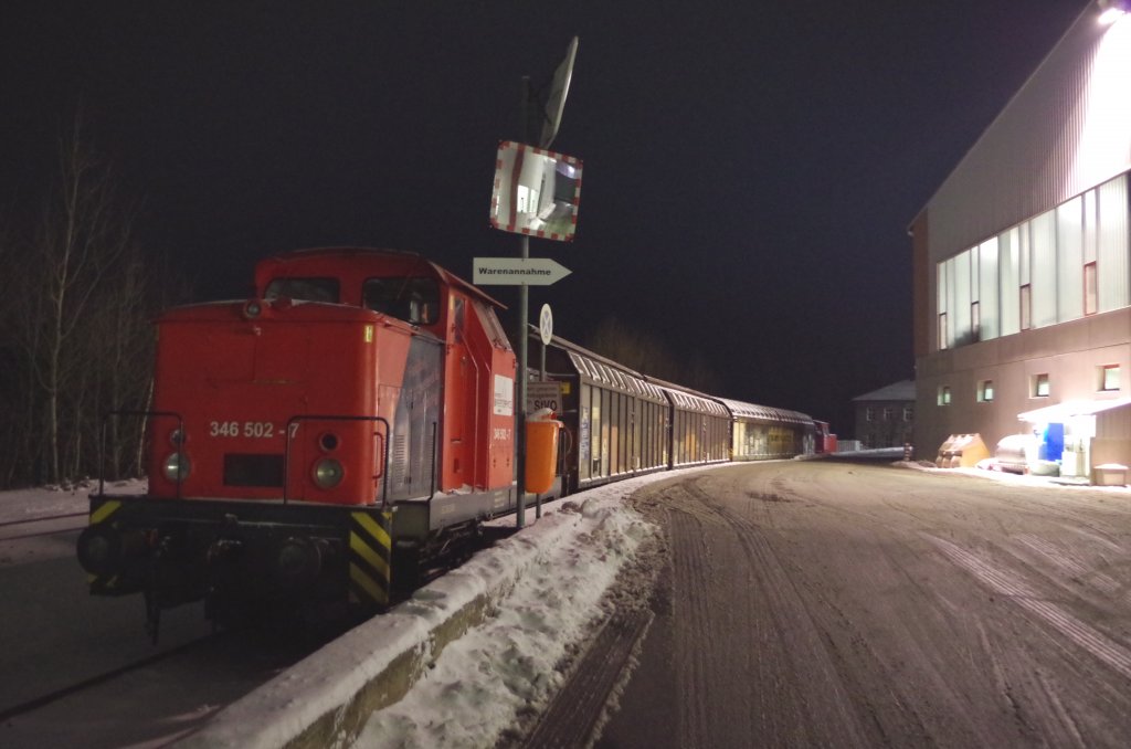 346 502 von Erfurter Bahnservice steht mit einem kurzem H-Wagenzug in Steinbach am Wald abgestellt. 18.01.2013