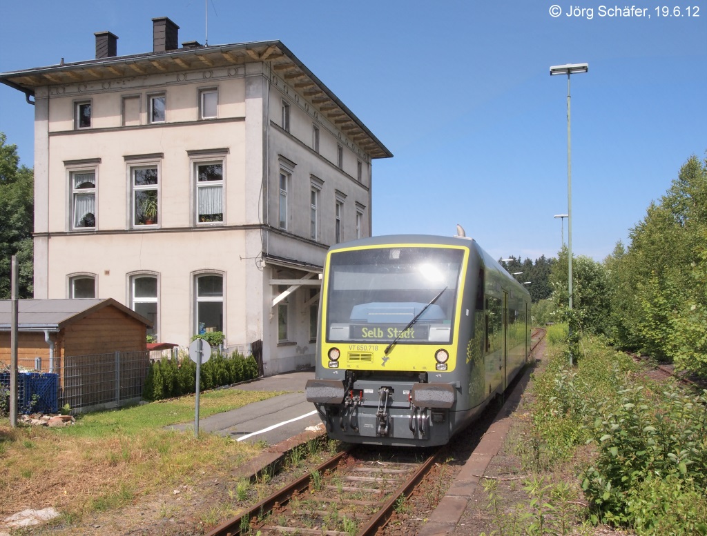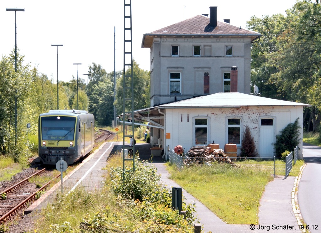 agilis VT 718 hält am 19.6.12 als RB nach Selb Stadt kurz in Plößberg am Hausbahnsteig. Ein einziges Gleis blieb im früher umfangreichen Abzweigbahnhof befahrbar.