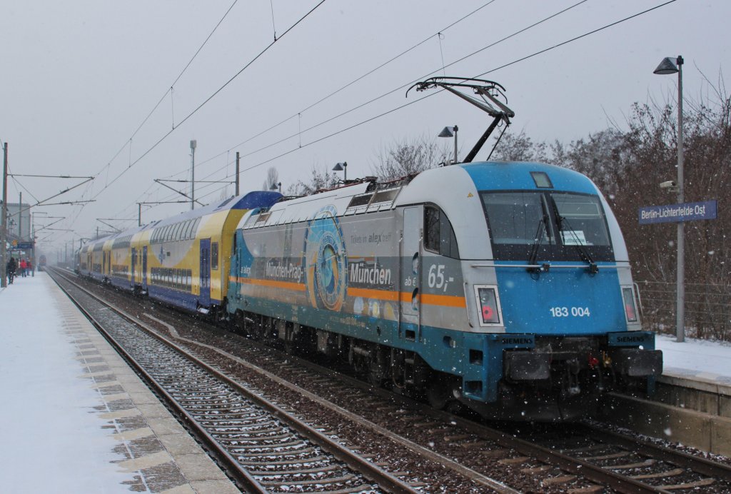 Berlin-Lichterfelde Ost am 14.01.2013 - ALEX 183 004 schiebt einen RE4 nach Ludwigsfelde. An der Zugspitze zieht MWB 182 912.