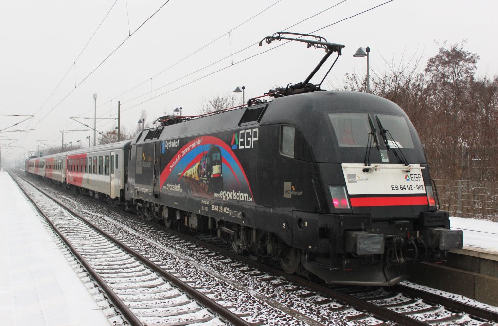Berlin-Lichterfelde Ost am 23.12.2012 - EGP ES64U2 002 schiebt einen RE4 nach Ludwigsfelde.