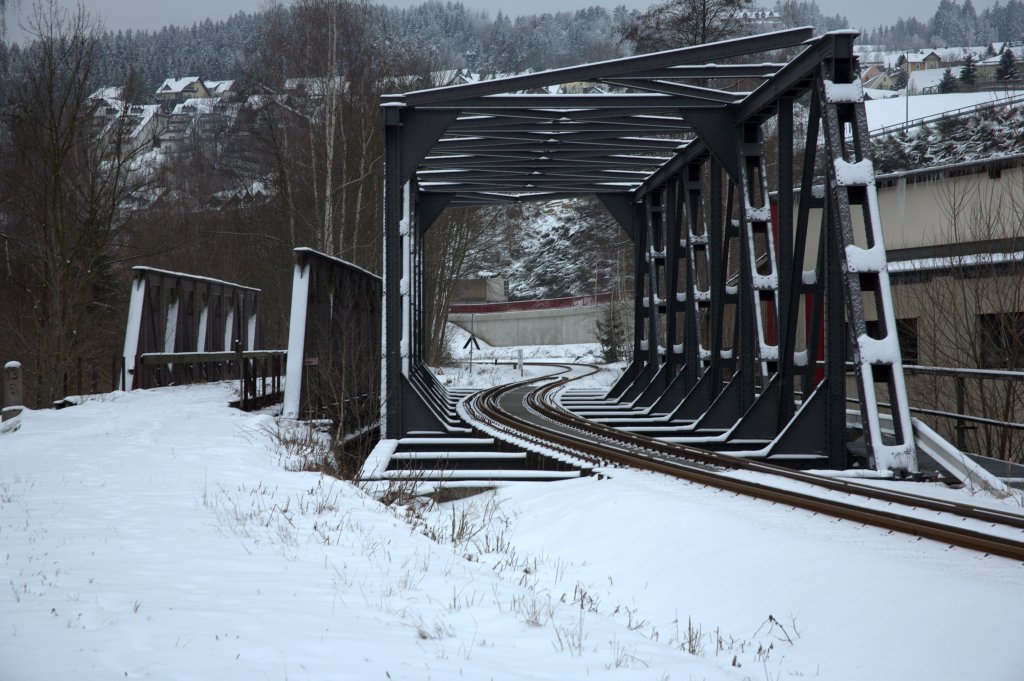 "Das Abschiedsfoto" der Erzgebirgswinterreise zeigt eine typische Fachwerkbrücke neu (rechts) und alt (links) der Strecke Schwarzenberg-Johanngeorgenstadt , die zu DDR Zeiten zur zweigleisigen Hauptbahn ausgebaut war. 19.01.2013 09:34 Uhr aufgenommen. Ort: Erla im Schwarzwassertal.