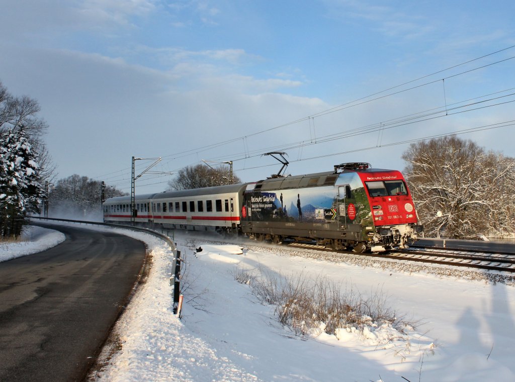 Die 101 083 mit den Wagen für den IC Rottalerland am 19.01.2013 unterwegs bei Pleinting.