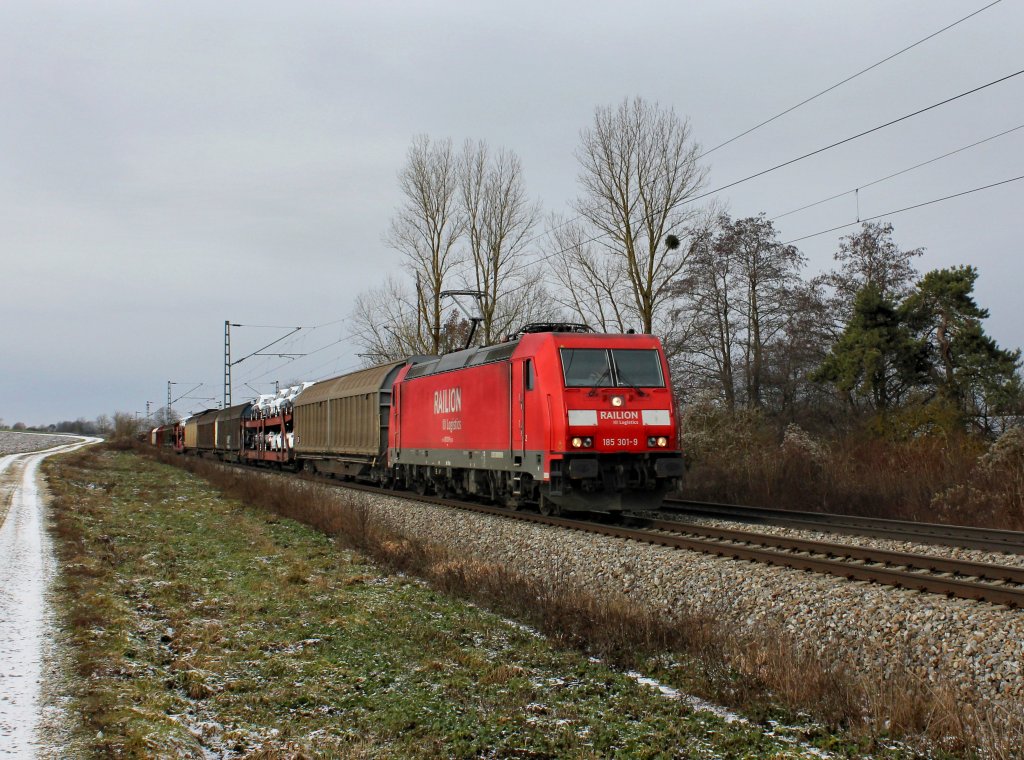 Die 185 301 mit einem Güterzug am 12.01.2013 unterwegs bei Langenisarhofen.