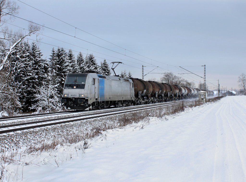 Die 185 673 mit einem Kesselzug am 19.01.2013 unterwegs bei Langenisarhofen.