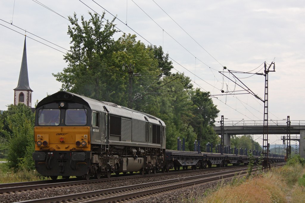 MRCE 653-09 am 15.8.12 mit einem leeren Schwellenzug in Thüngersheim.