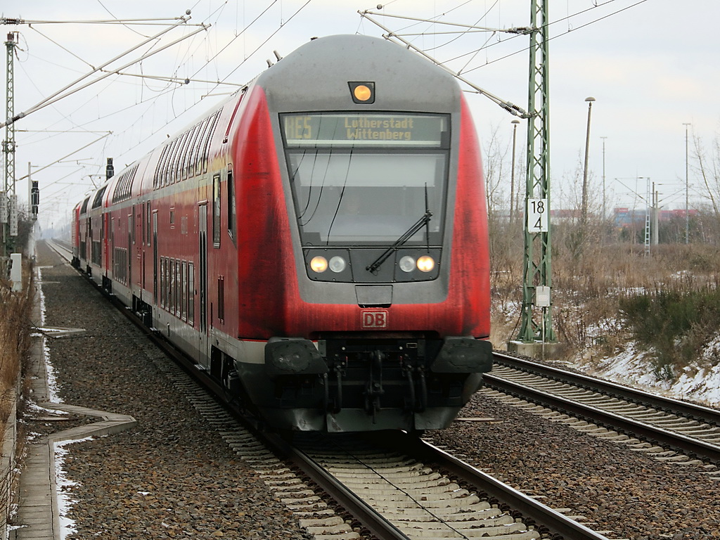 RE4 nach Ludwigsfelde - ein KISS-Doppelstockzug der ODEG wartet auf die Weiterfahrt. 19.1.2013, Wustermark