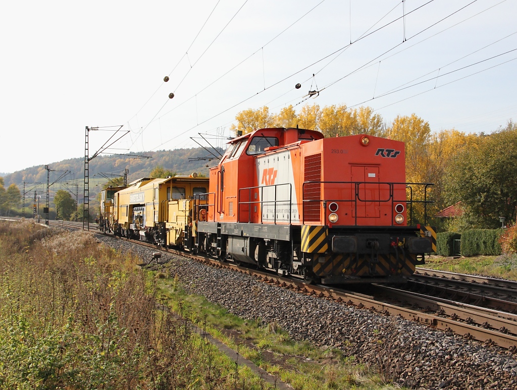 RTS 293 002 mit zwei Baumaschinen in Fahrtrichtung Norden. Aufgenommen bei Mecklar am 20.10.2012.
