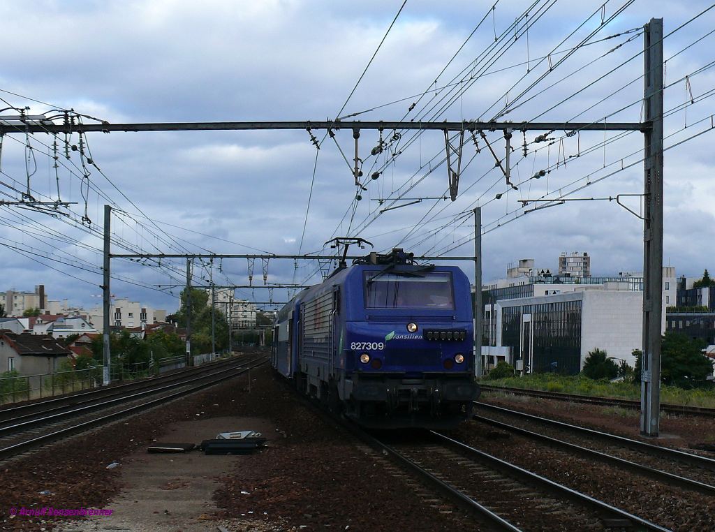 SNCF BB27309 ist mit leicht modernisierten Doppelstockwagen des Typs VB2N im Vorortverkehr als RER von Paris-Montparnasse in Richtung Versailles unterwegs. 2012-10-05 Clamart