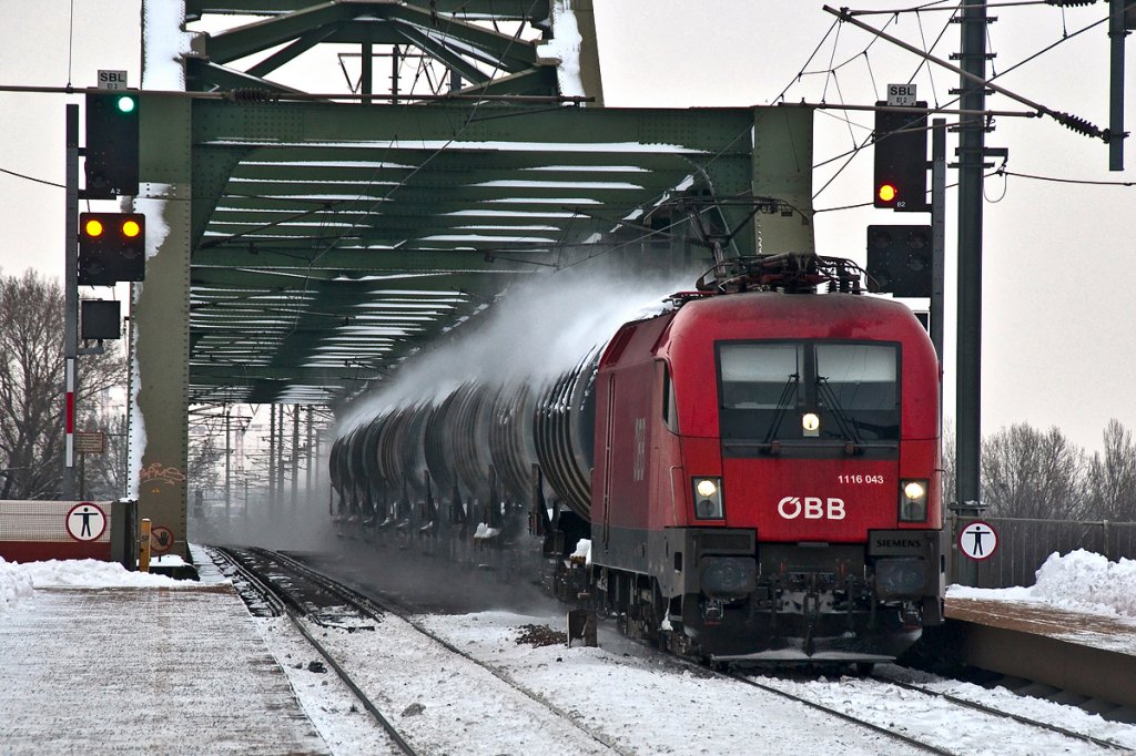 1116 043 mit Kesselwagenganzzug, am 19.01.2013 in Wien Praterkai (SRID 91029 von Stadlau nach Klagenfurt).
