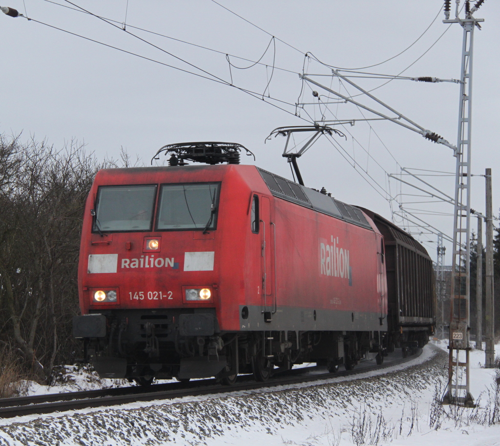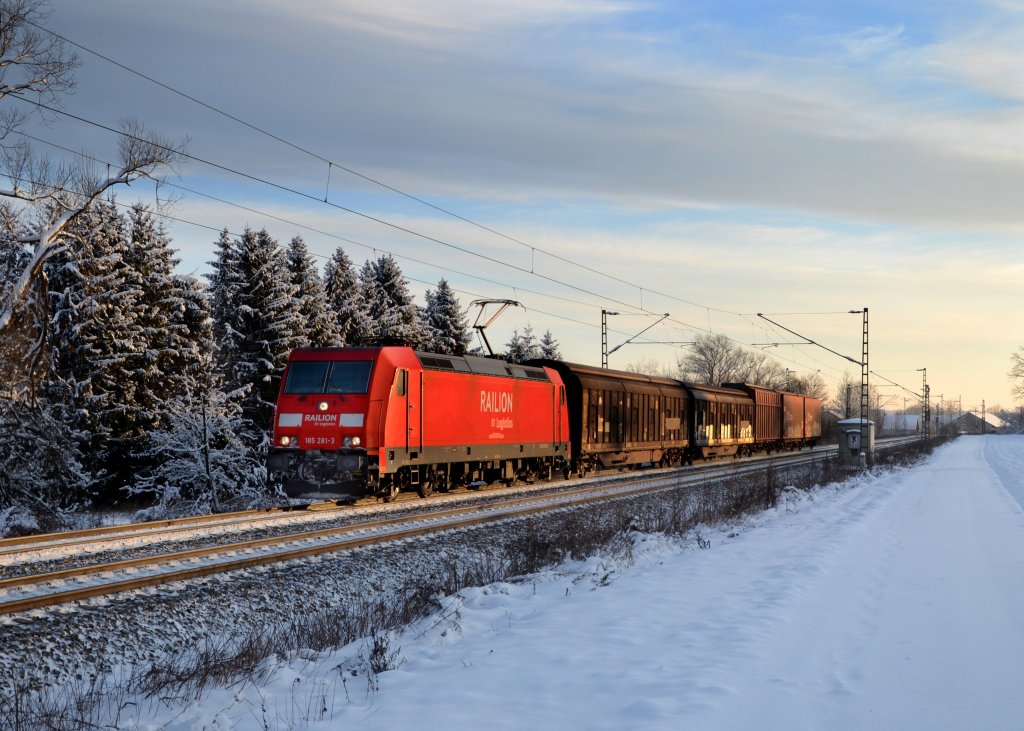 185 148-4 zieht am 20. Januar 2013 den Paneuropa/Terratrans-KLV aus Pressig-Rothenkirchen heraus.