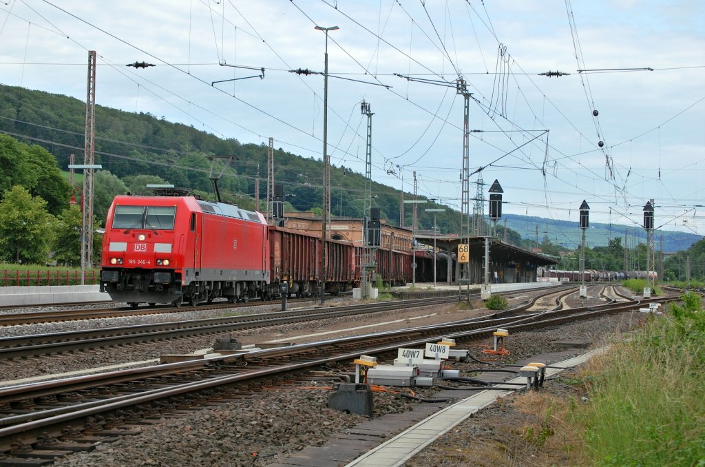 185 637-6 mit geschlossenen ARS-Autotransportwagen in Fahrtrichtung Süden. Aufgenommen am 24.10.2012 beim BÜ Eltmannshausen/Oberhone.