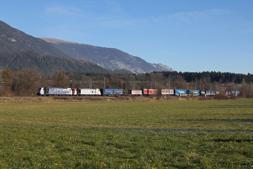 185 662 + 665 mit einem KLV Zug am 19.11.2011 bei Terfens.