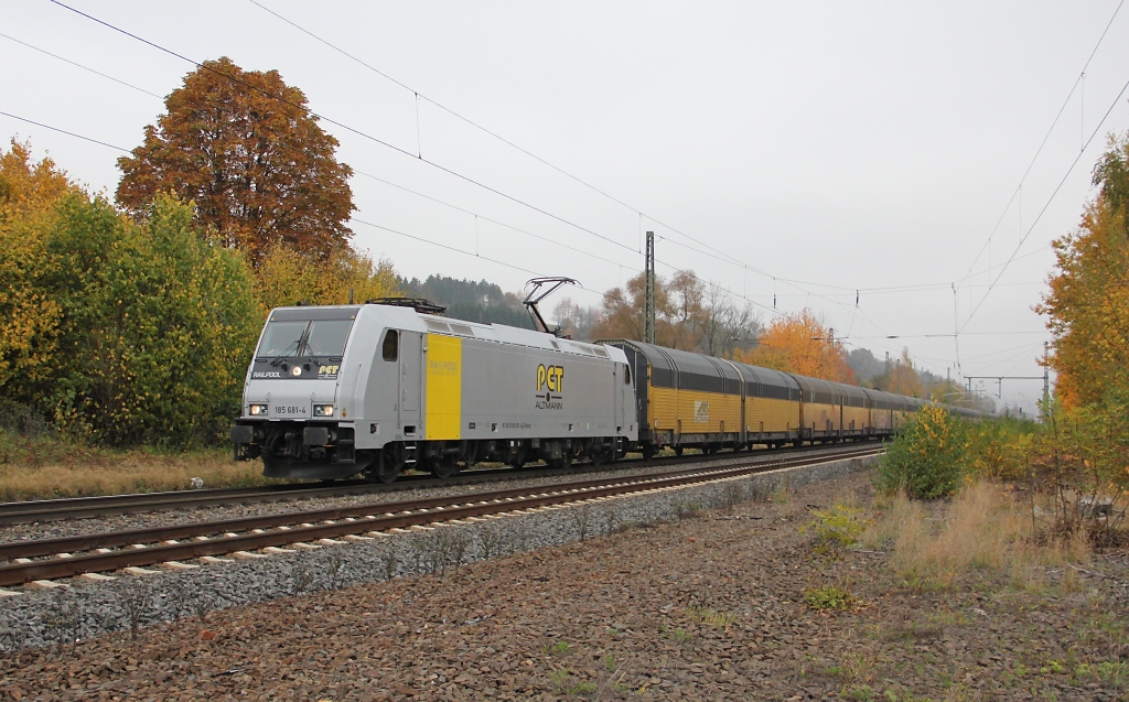 185 681-4 mit geschlossenen ARS-Autotransportwagen in Fahrtrichtung Süden. Aufgenommen am 24.10.2012 beim BÜ Eltmannshausen/Oberhone.