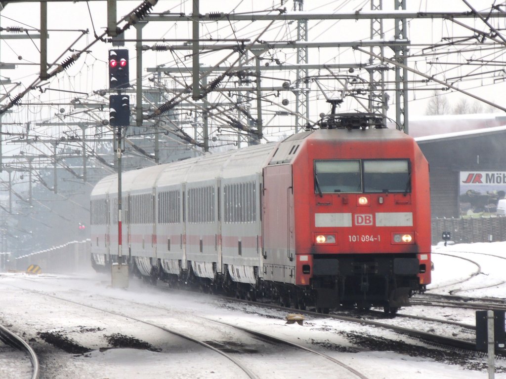 Einfahrt IC 2213 Binz-Stuttgart in Bergen/Rügen gezogen von 101 057 am 25.Januar 2013.Langsam verschwindet endlich der Schnee auf Rügen.
