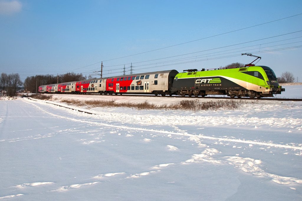 1116 142 "CAT" ist mit R 2238 am 26.01.2013 von Wien Meidling nach Retz unterwegs. Die Aufnahme entstand am frühen Nachmittag kurz nach Stockerau.