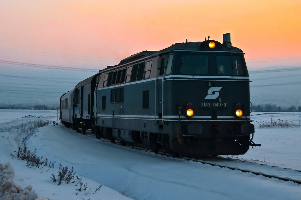 2143 40 ist mit dem ersten Sonderzug des Jahres "WANDERN & WEIN IM FACKELSCHEIN " von Wien Praterstern nach Ernstbrunn auf der Landesbahn unterwegs. Die Aufnahme entstand am späten Nachmittag des 26.01.2013 kurz vor Stetten.