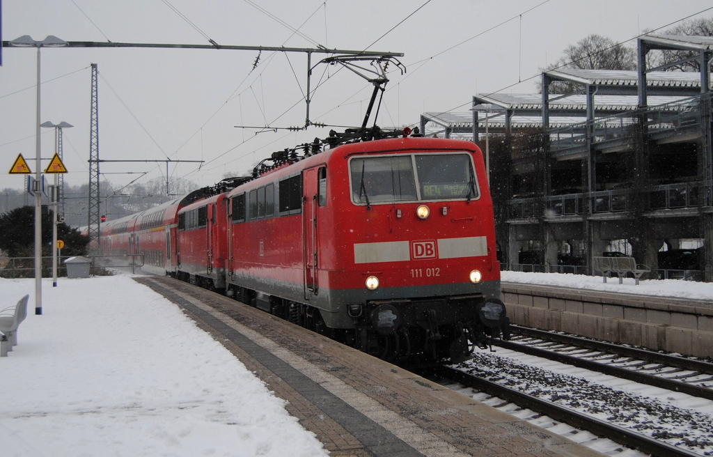 "Bahnsteigbild" des RE4 Wupperexpress auf dem Weg nach Aachen, in Herzogenrath am 26.1.2013. Zug Lok ist 111 012 und hat noch eine Weitere 111er am Harken.