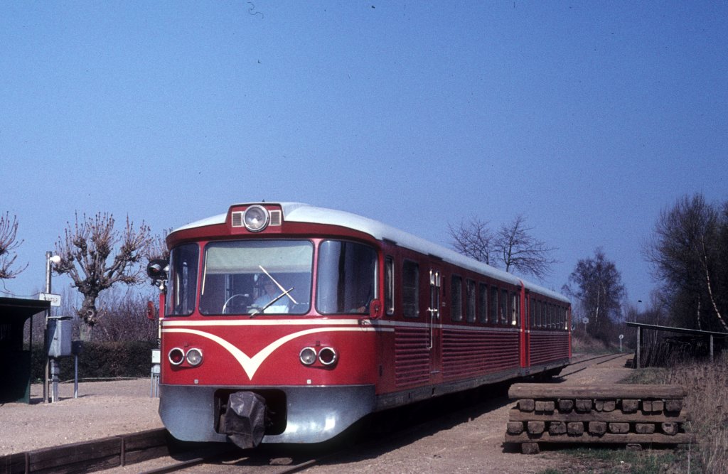 Ein Triebzug der HHGB, Helsingør-Hornbæk-Gilleleje-Banen, hält am 11. April 1974 am Haltepunkt Skibstrup.