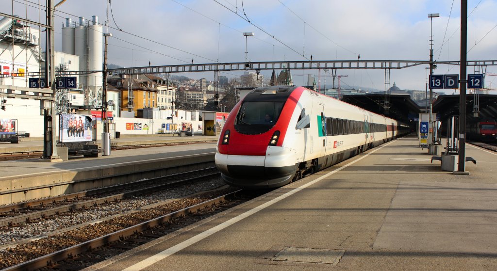 ICN "Johanna Spyri" ist am 12.01.2012 als ICN 1524 von St.Gallen nach Lausanne unterwegs und verlässt nach dem planmäßigen Halt Zürich HB.