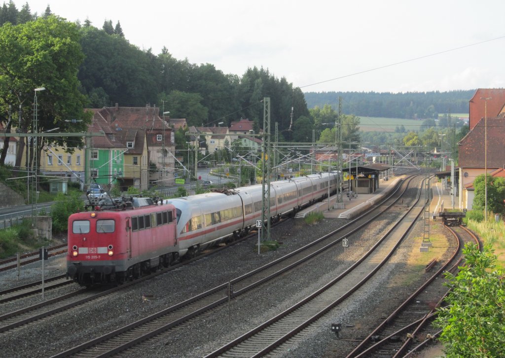 115 205-7 zieht am 10. Juli 2013 den 411 001 "Neustadt an der Weinstraße" durch Kronach in Richtung Nürnberg.
