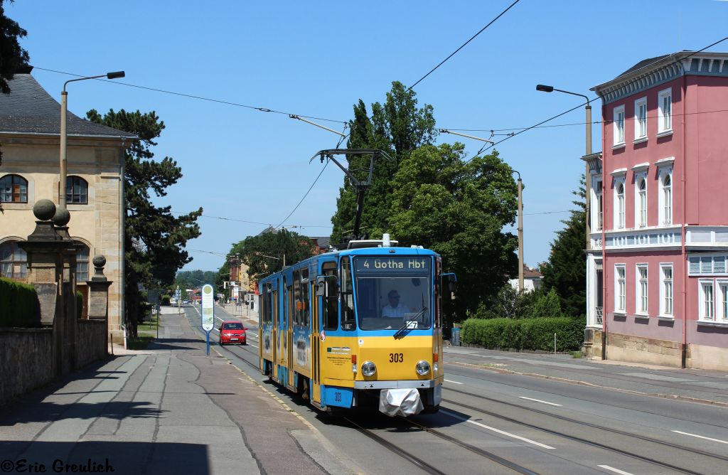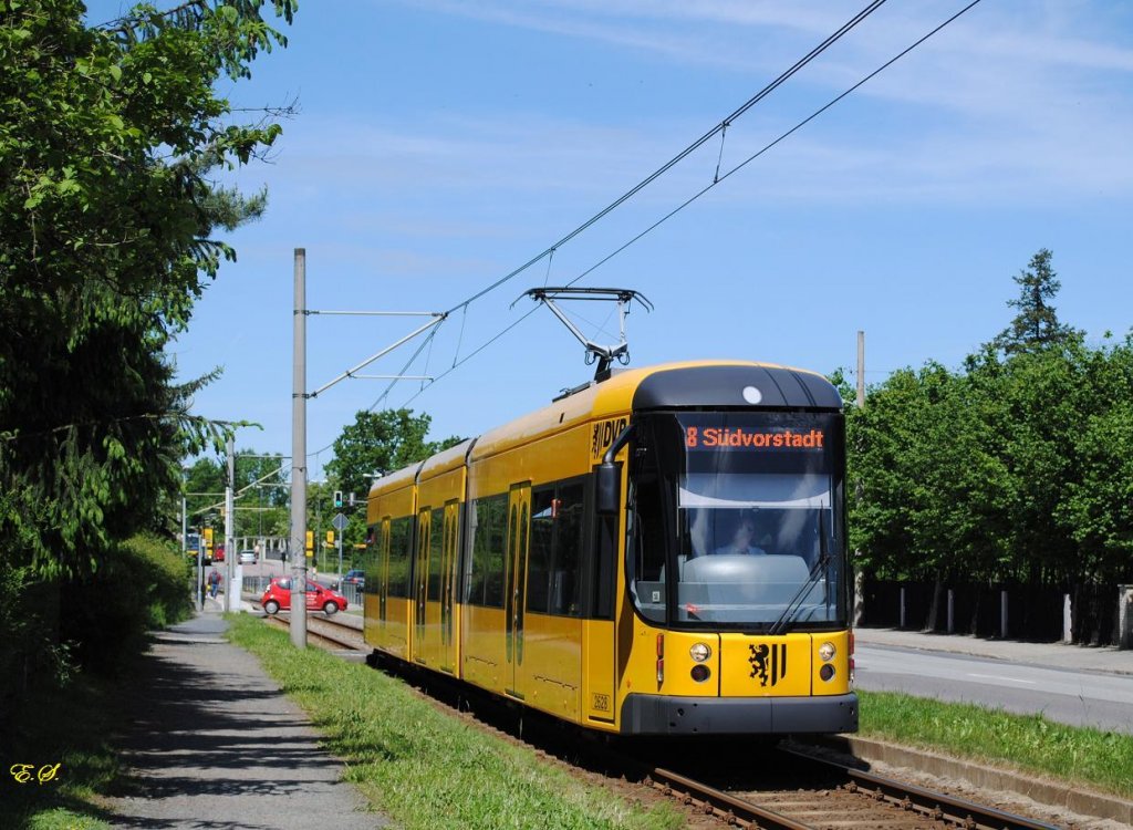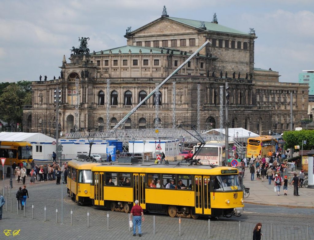 Wegen des Elbhochwassers im Juni 2013 mußten die DVB auch auf die Fahrzeugreserven der Tatrafahrzeuge zurückgreifen.Hier sehen wir ein T4DMT-Tandem vor der Semperoper.(06.06.2013)