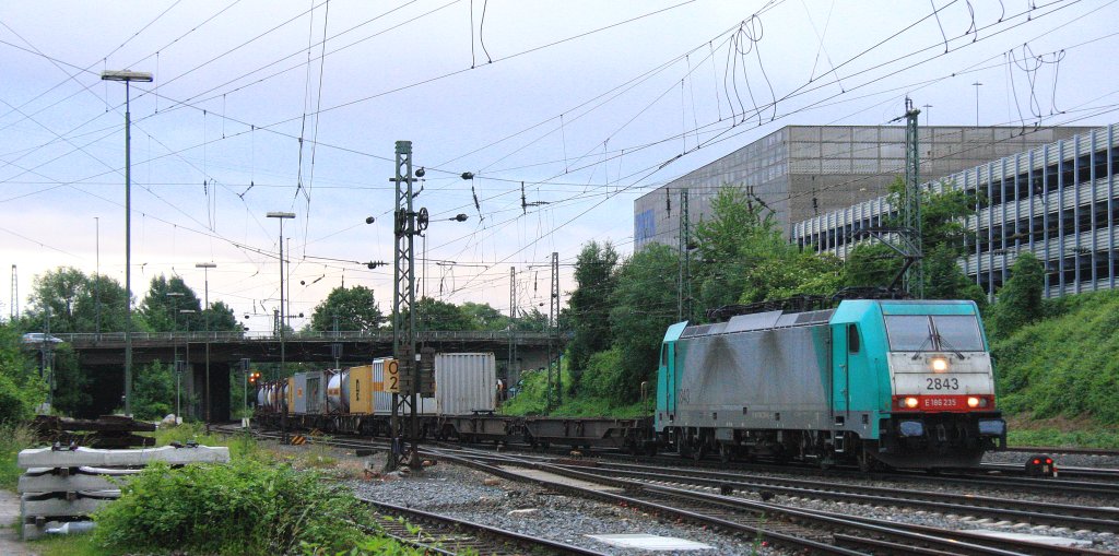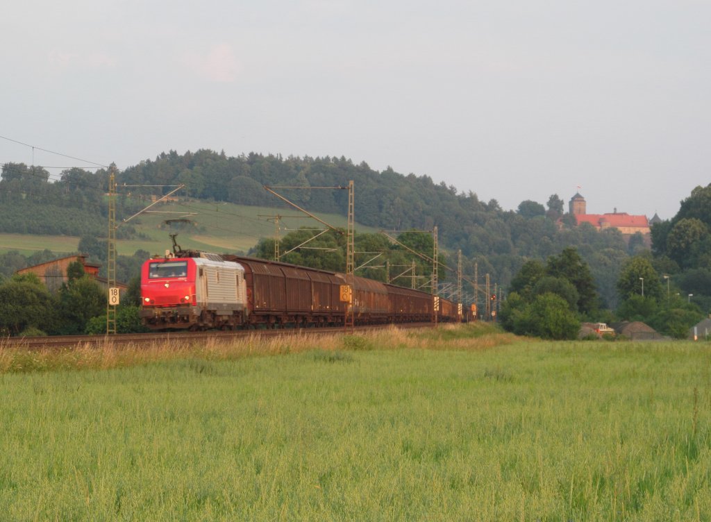 186 110 "Rail Magazine" der Rurtalbahn zieht am 10. Juli 2013 einen Kesselwagenzug durch Kronach in Richtung Lichtenfels.