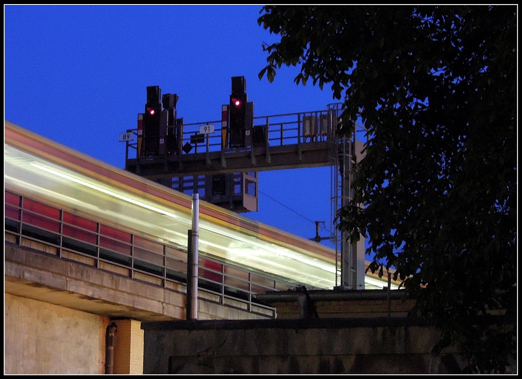 Eine Nacht am Berliner Bahnhof "Friedrichstraße": Signalbrücke auf der Stadtbahn, kurz vor der Station - an der Straße Am Kupfergraben. 9.7.2013
