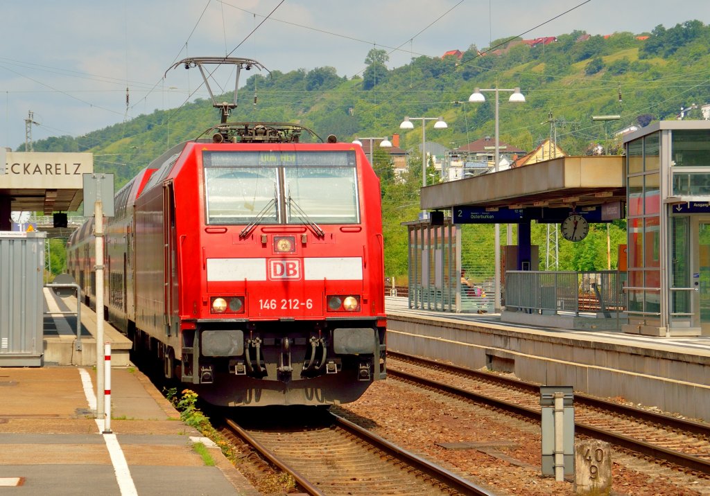 Mit einer RB nach Ulm steht die 146 212-6 an Gleis 1 im Bahnhof Neckarelz. 6.7.2013