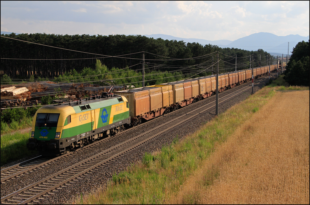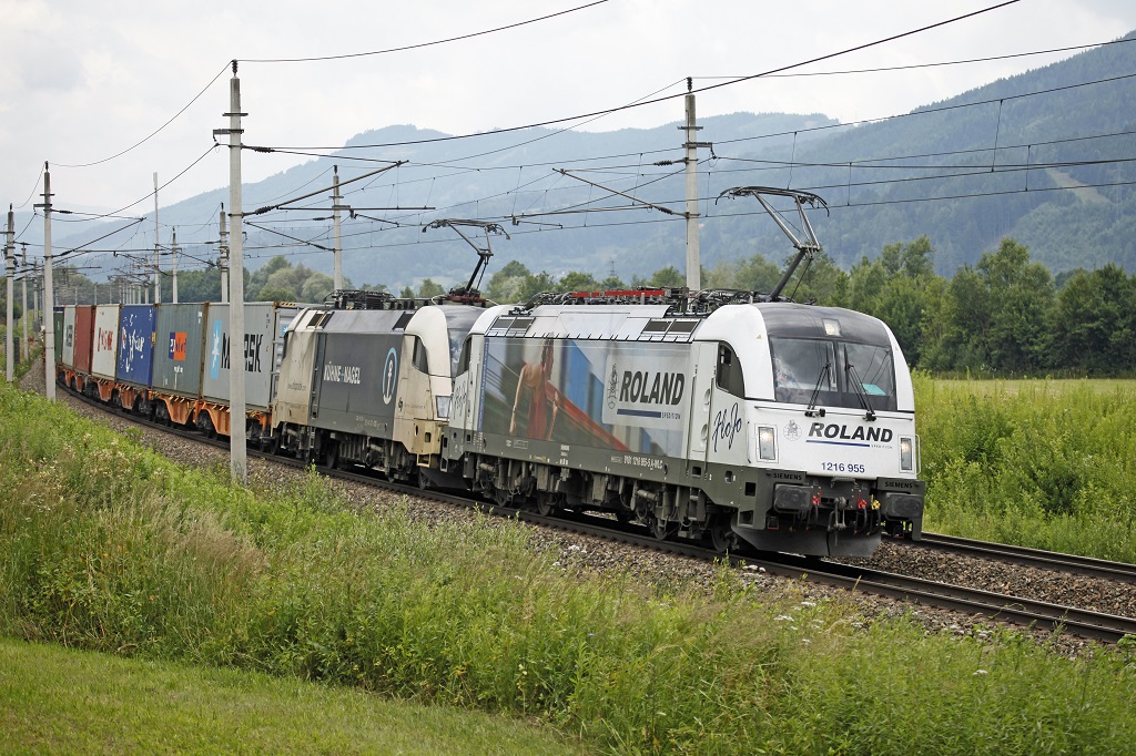 1216 955(Roland) und eine WLB-182er ziehen am 11.07.2013 Zug 61451 bei Niklasdorf Richtung Bruck an der Mur.