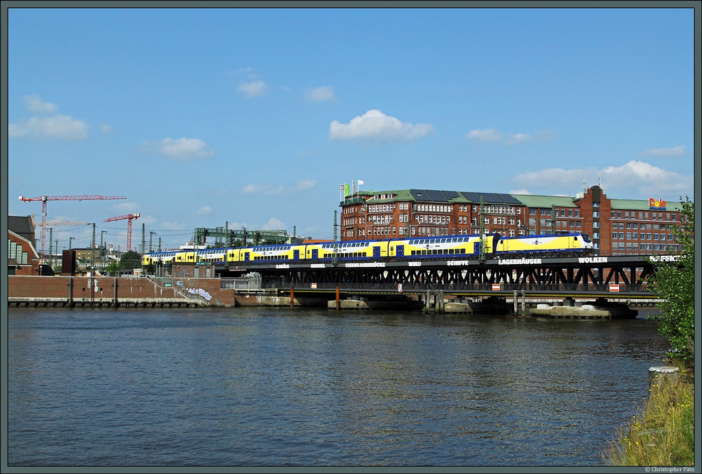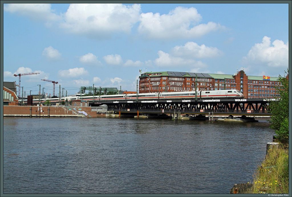 ICE 1 Tz 73, angeführt von 401 573-1, rollt am 05.07.2013 als ICE 671 nach Karlsruhe über die Oberhafenbrücke in Hamburg. Der führende Triebkopf wurde 2006 in Thun (Schweiz) bei einem Unfall schwer beschädigt, aber mithilfe von Ersatzteilspendern wieder aufgebaut.