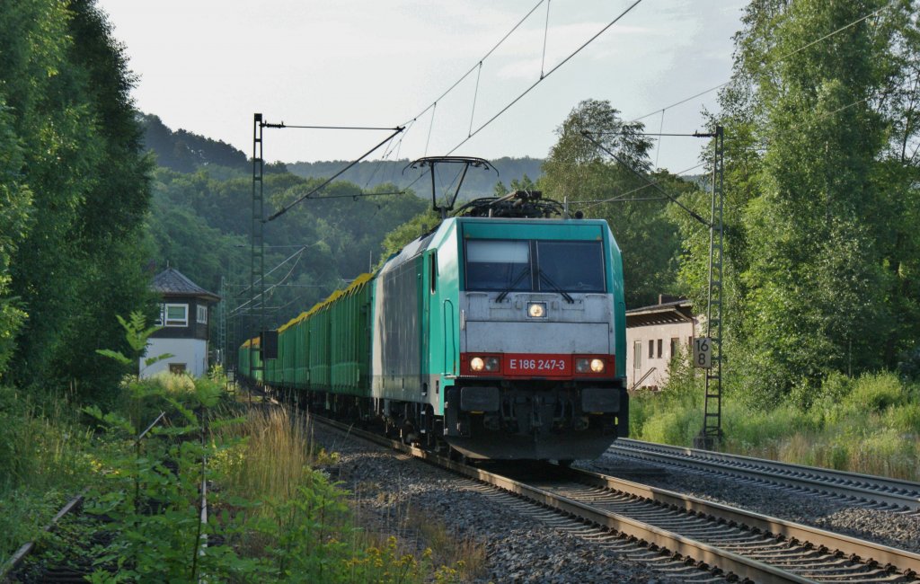 186 247-3 mit einen leeren Holzzug am 11.07.13 in Vollmerz.