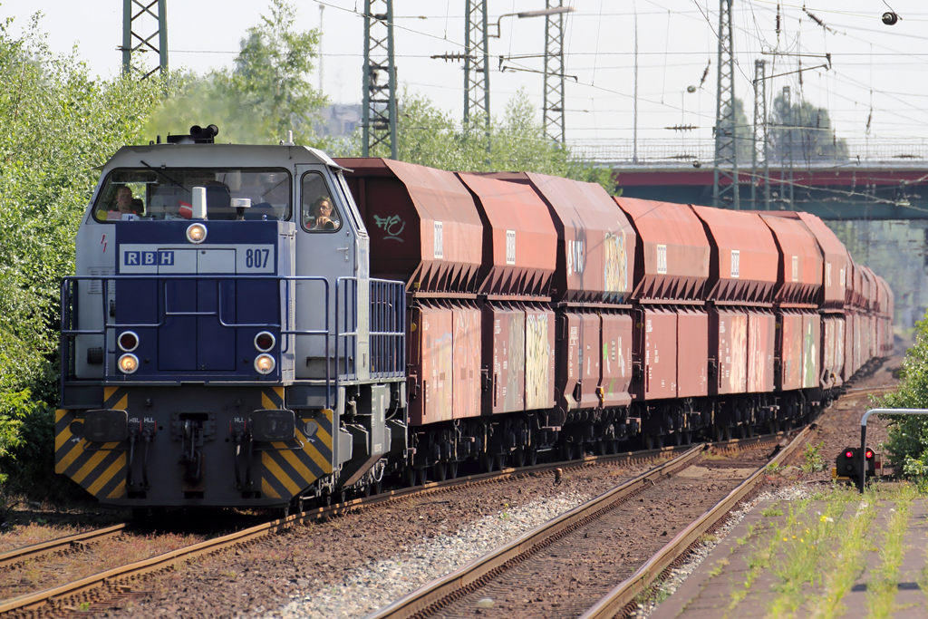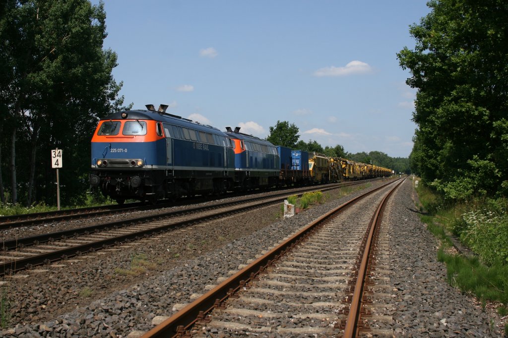 Die BBL 17 (BBL LOGISTIK GMBH), ex DB 225 099-1, ex DB 215 099-3, bringt am 11.07.2013 den MATISA Umbauzug P95 (Schweres Nebenfahrzeug-Nr. 97 27 02 506 17-1) der Schweerbau sowie weitere Wagen nach Burbach-Würgendorf, zur Gleisbaustell an der KBS 462 (Hellertalbahn), hier erreicht der Zug gerade den Bü km 105,2. Die V 160 wurde 1970 bei Henschel in Kassel unter der Fabriknummer 31455 gebaut und als 215 099-3 an die DB geliefert. Im Jahr 2001 erfolgte der Umbau und Umbezeichnung in 225 099-1 und nun im Frühjahr 2013 kam sie zur BBL LOGISTIK GMBH als Lok 17 (NVR-Nummer 92 80 1225 099-1 D-BBL). Technische Daten der Lok, welche weitestgehend denen der Baureihe 215 entsprechen, da diese daraus hervorging. Anzahl umgebauter Loks: 74 Achsformel: B'B' Spurweite: 1.435 mm Länge: 16.400 mm Drehzapfenabstand: 8.600 mm Drehgestellachsstand: 2.800 mm Gesamtradstand: 11.400 mm Gewicht: 79 Tonnen Radsatzfahrmasse: 20,0 Tonnen Höchstgeschwindigkeit: 140 km/h (90 km/h im Rangiergang) Motorentyp: MTU MB 16V 652 TB 10 (ein V16-Zylinder-Diesel-Motor), dieser Motor war leistungsschwächer aber zuverlässiger als der in anderen Maschinen verbaute MTU 12V 956 TB Motor mit 2.500 PS. Dauerleistung: 1.397 kW (1.900 PS) Nenndrehzahl: 1500 min-1 Leistungsübertragung: hydraulisch Getriebe: Voith L 820 brs Tankinhalte: 3.050 l (Kraftstoff) / 2.850 l (Wasser) / 690 l (Heizöl) / 320 kg Sand Zugheizung: Dampf Zugsicherung: PZB 90