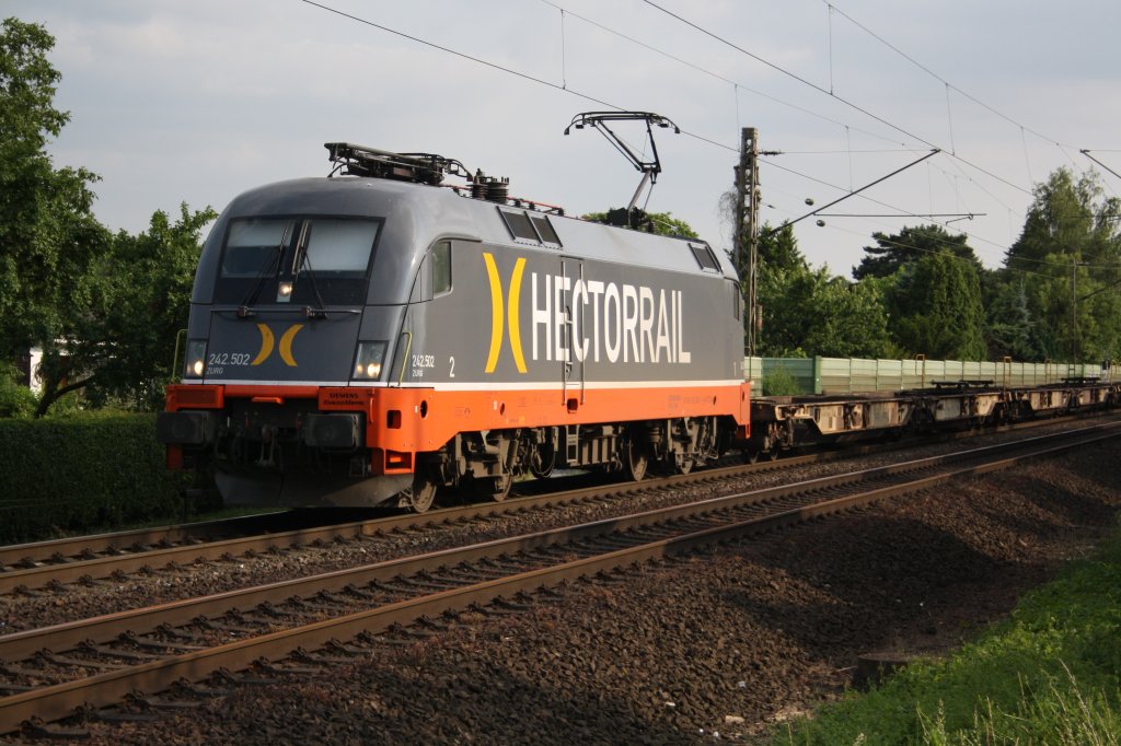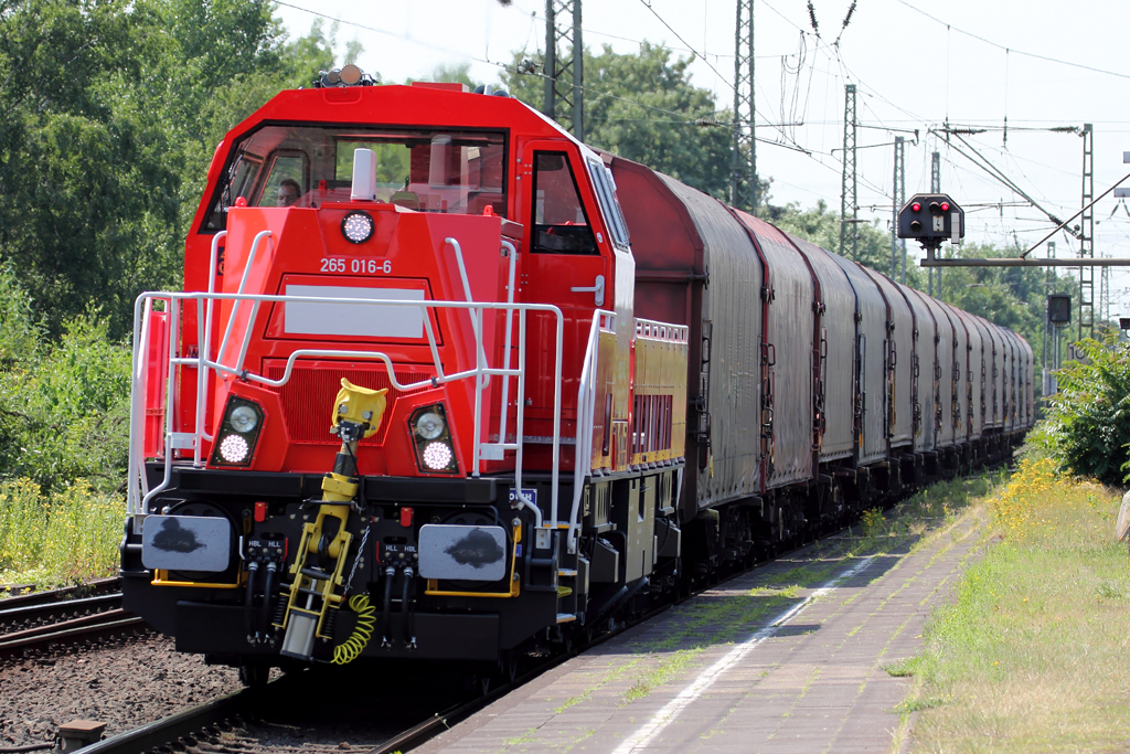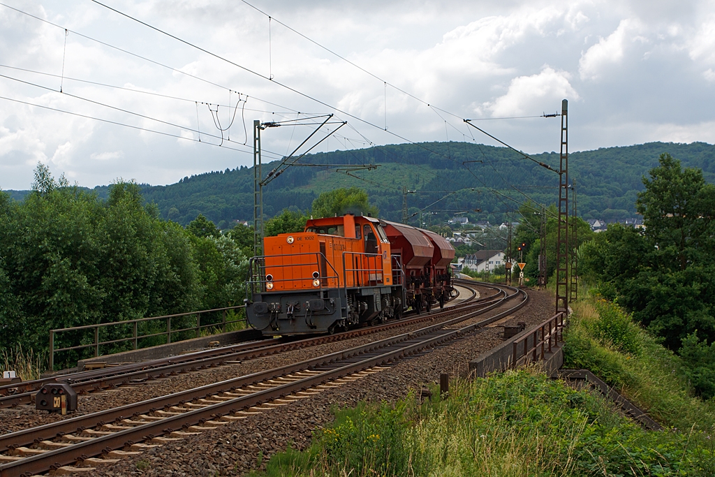 Etwas im Gegenlicht - Die Lok 41 (eine MaK DE 1002) der Kreisbahn Siegen-Wittgenstein (KSW), zieht am 11.07.2013 bei Haiger zwei Gedeckte Schüttgutwagen mit dosierbarer Schwerkraftentladung und zwei Radsätzen (Tds 937) in Richtung Siegen. Diese Wagen werden verwendet für den Transport von Ammoniumnitrat welches unteranderem zur Sprengstoff Herstellung dient. Auf Grund der Gleisbaustelle auf der Hellertalbahn musste sie über Haiger nach Siegen (über die KBS 445 - Dillstrecke) fahren. Die DE 1002 wurde 1988 bei MaK unter der Fabriknummer 1000832 gebaut und an die HEG - Hersfelder Eisenbahn GmbH als 832 geliefert. Nach Einstellung des Bahnbetriebes der HEG ging sie konzernintern an die HLB - Hessische Landesbahn GmbH Lok 832 und 1996 wurde sie an die frühere Siegener Kreisbahn GmbH als Lok 41 verkauft, die heute als Kreisbahn Siegen-Wittgenstein firmiert. Die Lok hat heute die NVR-Nummer 98 80 0272 008-0 D-KSW und die EBA 02B20K 001. Gegenüber den 16 Loks dieses Typs der HGK hat diese Lok einen MTU 12V396TC13 Motor mit 1.120 kW (1.523 PS) Leistung. Die Leistungsübertragung erfolgt einen Generator auf 4 elektrische (Drehstrom) Fahrmotoren. Generator und die Fahrmotoren sind von BBC (heute ABB). Die Lok hat eine Höchstgeschwindigkeit von 75 km/h.