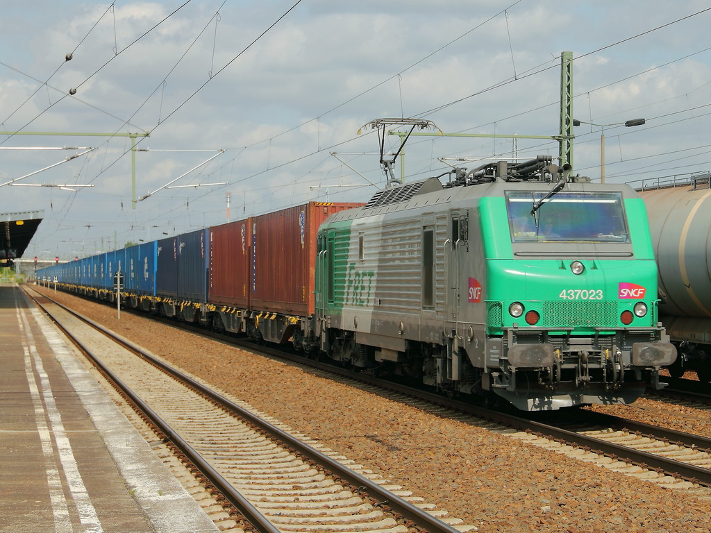 437 023 ein  SNCF Fretchen  mit einem Containerzug  am 10. Juli 2013 bei der Durchfahrt durch den Bahnhof  Berlin Flughafen Schönefeld.